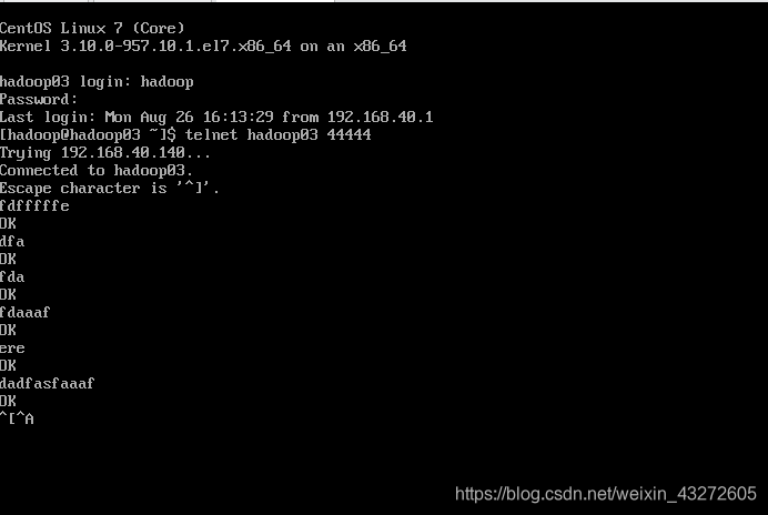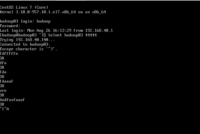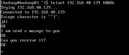 假设我们用hadoop03通过telnet向hadoop02的10086端口些信息,那么看看是否能够接受到。