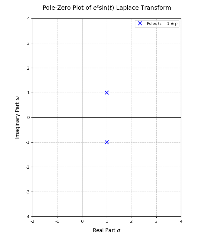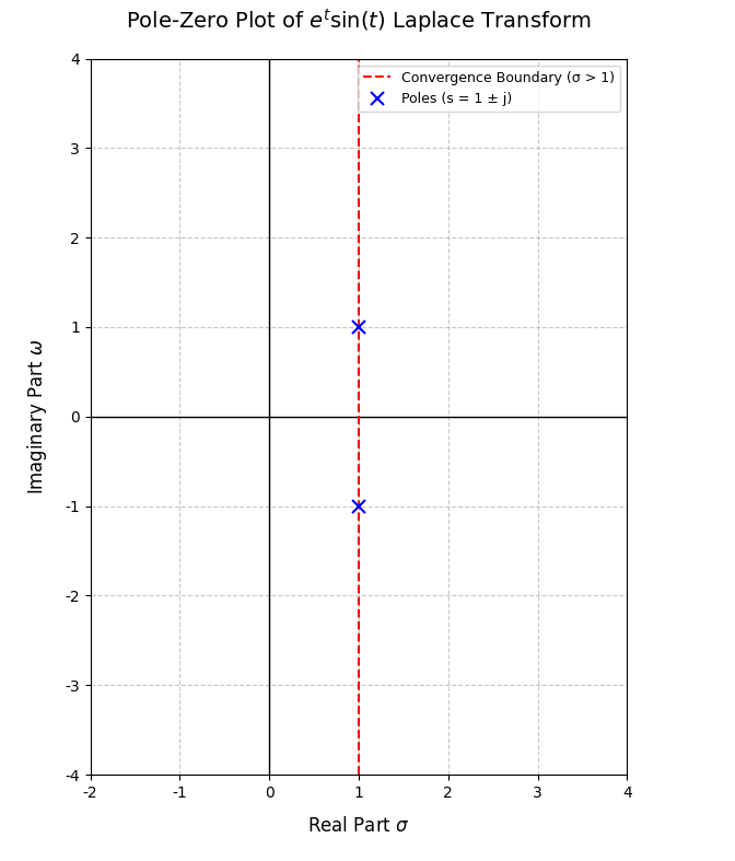 其次,在σ=1\sigma=1σ=1这个临界状态上,信号的拉氏变换仅在1+j1+j1+j、1−j1-j1−j两个复频率上无定义(趋于∞\infty∞),这两个点便是信号的极点,图中用×\times×标记表示;