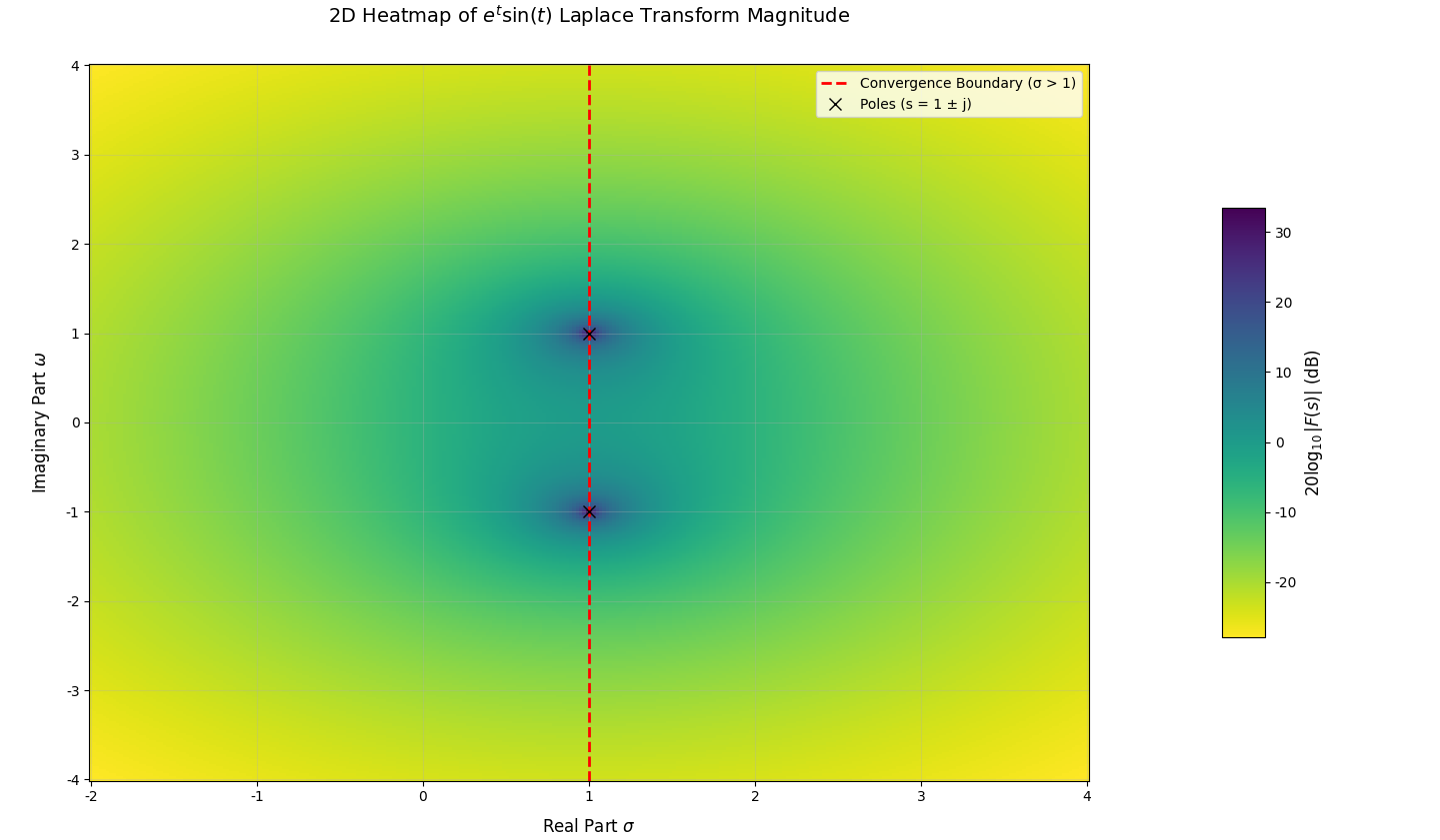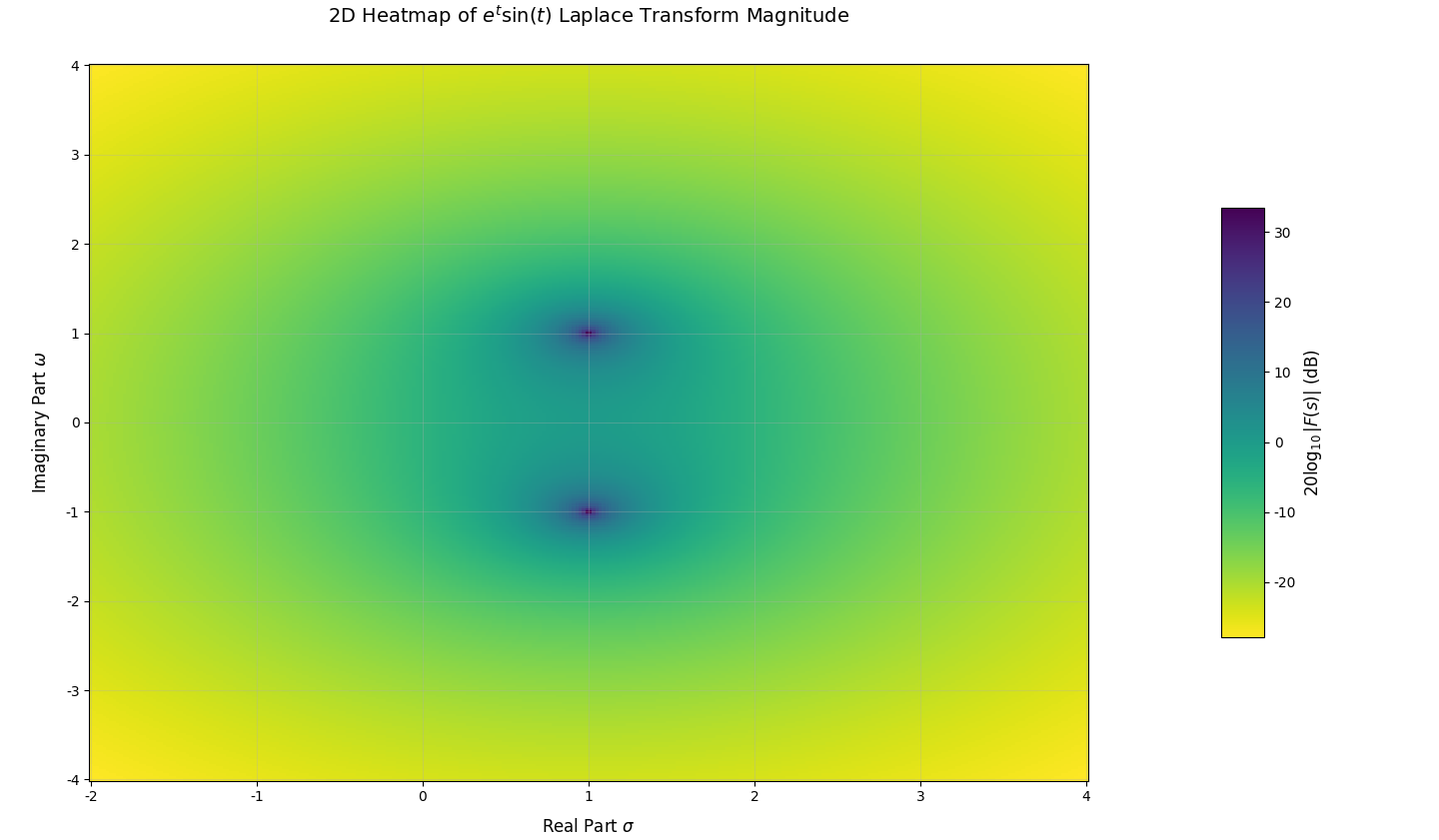 由上面的图像推导过程可知,图像成立的前提是σ>1\sigma>1σ>1,故σ≤1\sigma\leq1σ≤1部分无实际意义,这部分中信号的拉氏变换不存在。图像所展示的可以认为是函数在该区域的解析延拓。当然,三维图像还是不便展示和观察,我们不妨以σ\sigmaσ和jωj\omegajω为轴,通过二维热图展示结果,即有: