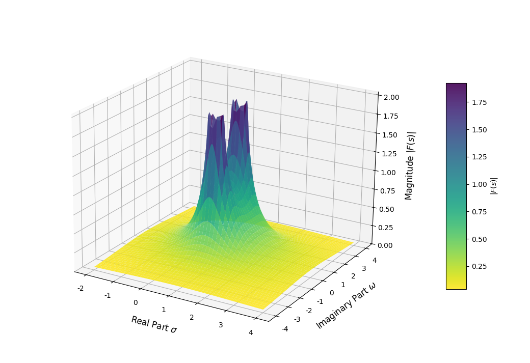 我们在傅里叶变换的讨论中,通过F(ω)∼ωF(\omega)\sim \omegaF(ω)∼ω描述信号频谱,为了直观表示出个频率下对应的信号强度变化,我们对频谱取模,使用幅度谱∣F(ω)∣∼ω|F(\omega)|\sim\omega∣F(ω)∣∼ω来描述信号,把幅度谱放在平面直角坐标系中。现在,信号在拉氏变换后得到变量s=σ+jωs=\sigma+j\omegas=σ+jω,在不同σ\sigmaσ取值下有不同的幅度谱,固定后再研究此时对应的幅度谱图像固然是一个比较好的方法,但是,我们不妨在原始幅频分析的平面坐标系上在加一个轴对应σ\sigmaσ的取值,构成三维空间坐标系来表示幅度变化。这样我们不仅可以了解当σ\sigmaσ确定时的幅频变化F(jω)∣σ=σ0F(j\omega)|_{\sigma=\sigma_0}F(jω)∣σ=σ0,还可以了解σ\sigmaσ取值变化引起的幅频变化的大小。