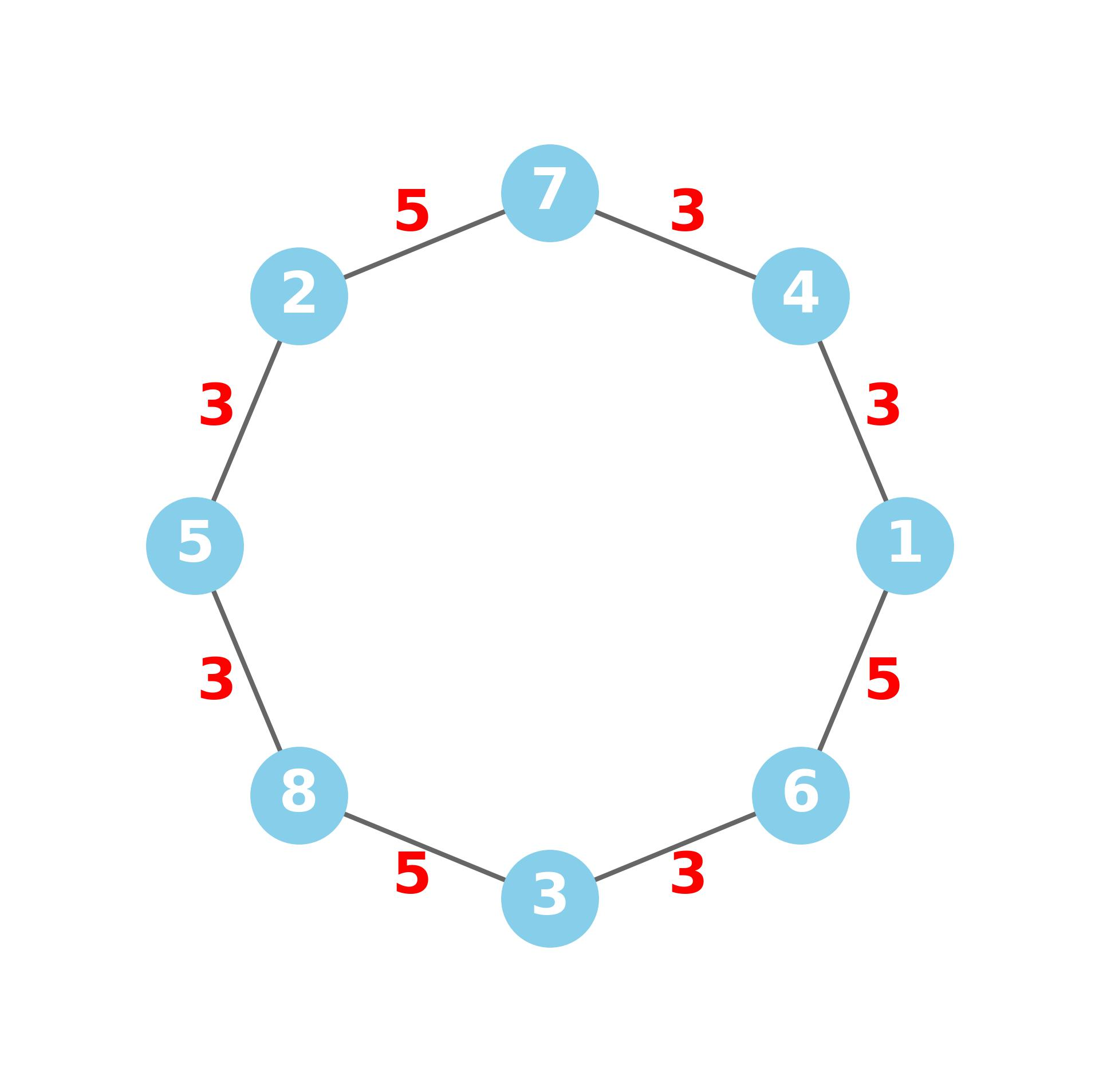 比如有 $n = 8$,取 $p = 3$ 和 $q = 5$,构造的方式如下:${\color{Red}{1}}, \, 1\mathrm{+}3\mathrm{=}{\color{Red}{4}}, \, 4\mathrm{+}3\mathrm{=}{\color{Red}{7}}, \,7\mathrm{-}5\mathrm{=}{\color{Red}{2}}, \, 2\mathrm{+}3\mathrm{=}{\color{Red}{5}}, \, 5\mathrm{+}3\mathrm{=}{\color{Red}{8}}, \, 8\mathrm{-}5\mathrm{=}{\color{Red}{3}}, \, 3\mathrm{+}3\mathrm{=}{\color{Red}{6}}$。