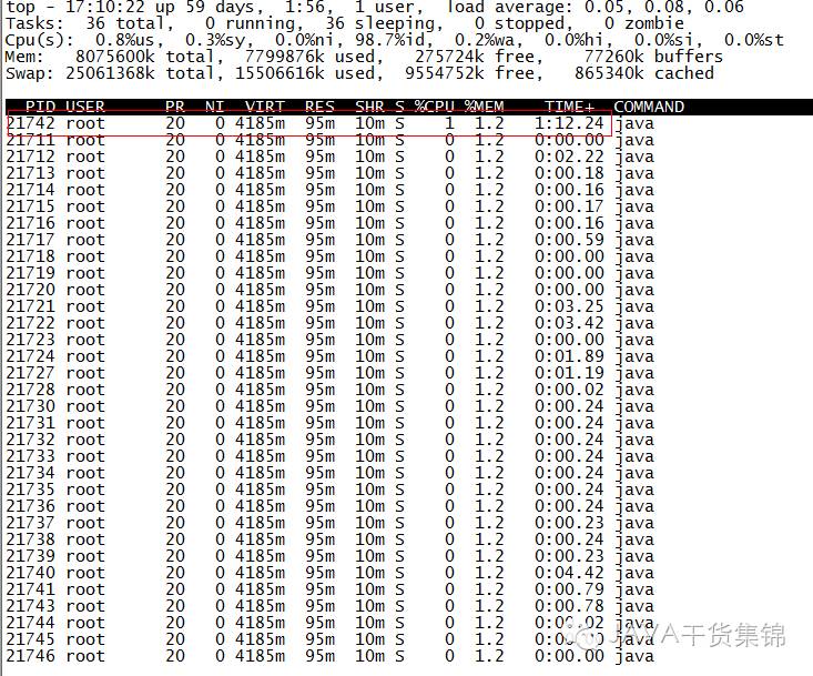 TIME列就是各个Java线程耗费的CPU时间,CPU时间最长的是线程ID为21742的线程,用