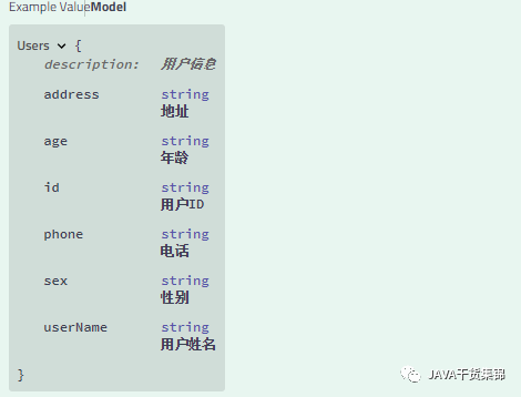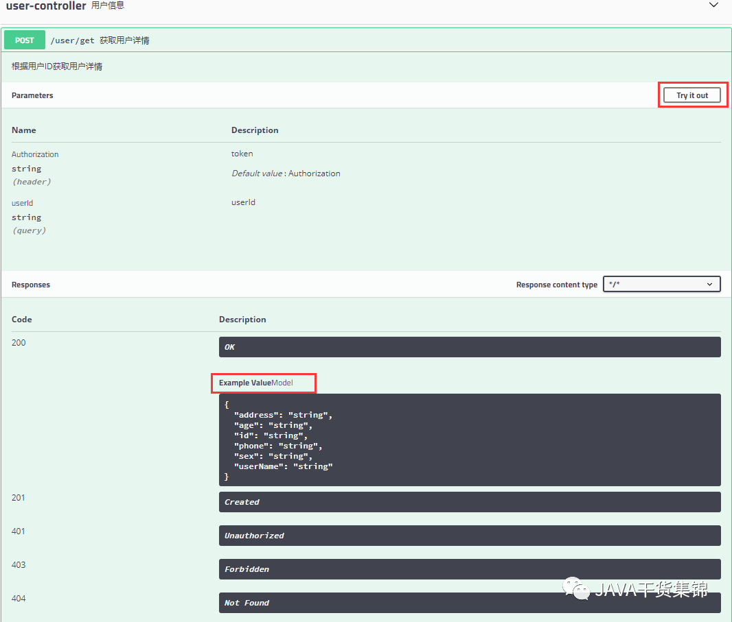 6、点击获取用户详情的接口,try it out ,可以针对此接口进行访问调试,点击Model可以查看用户实体