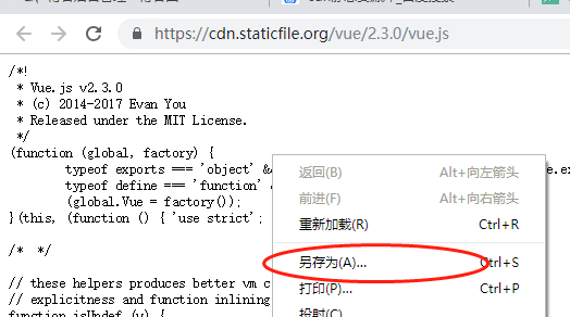 也可以下载vue.js文件:将上面的地址复制到地址栏打开然后另存为就可以了