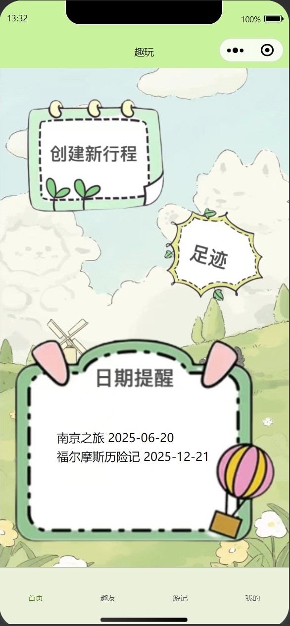 有两个选项:创建新行程,足迹,分别对应创建新行程,足迹页面,日期提醒通过查询当前用户所创建的旅行按日期由近即远显示6条;