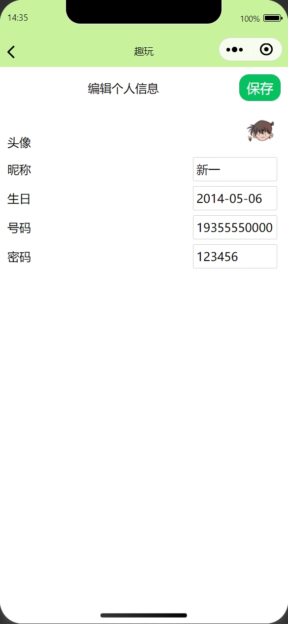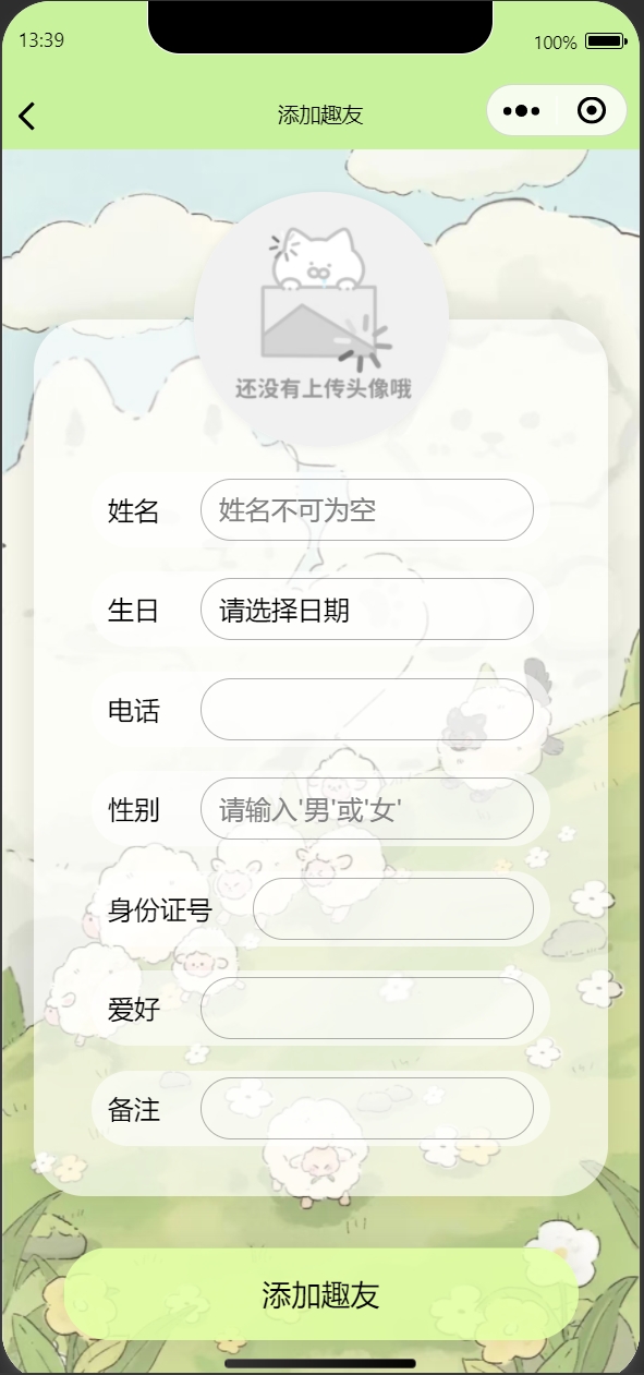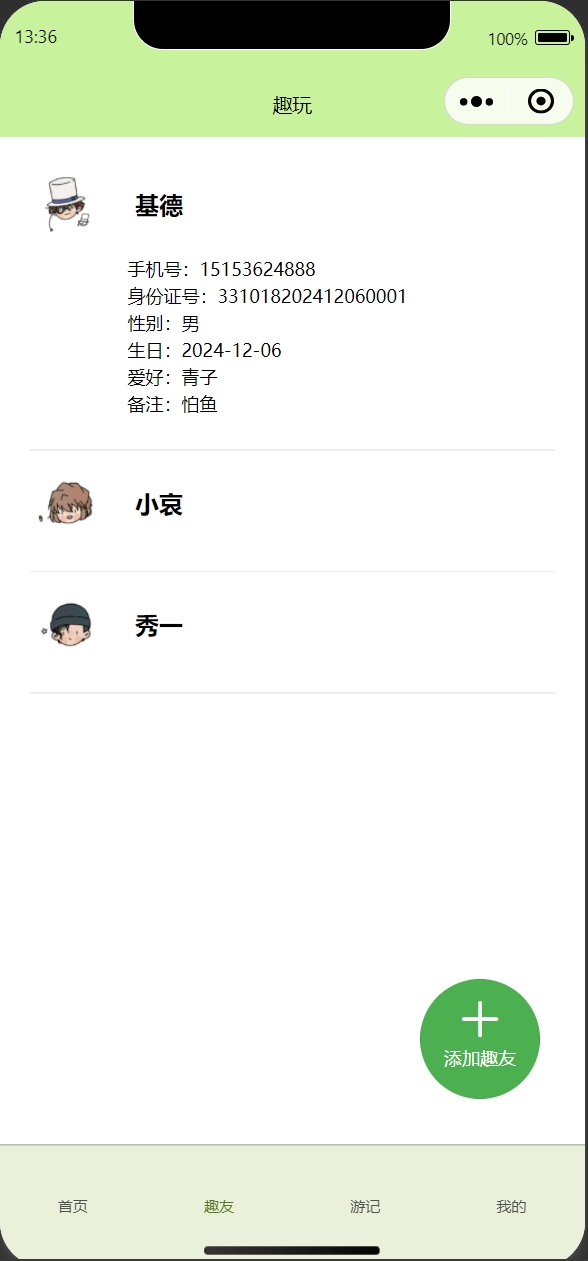 此界面可以上传趣友头像,输入趣友的姓名,生日,电话,性别,身份证号,爱好,备注