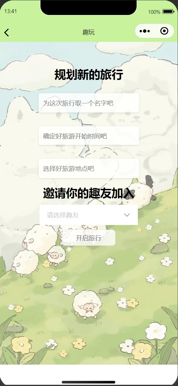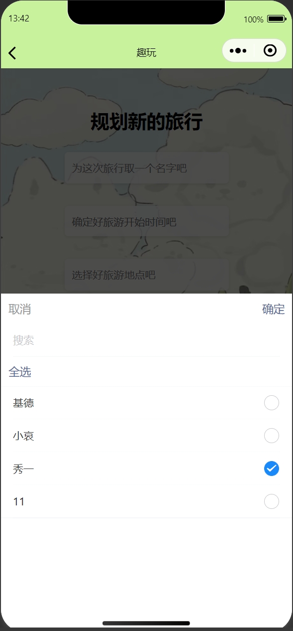 在此界面输入旅行的标题,选择开始时间,输入旅游地点,通过复选框选择趣友