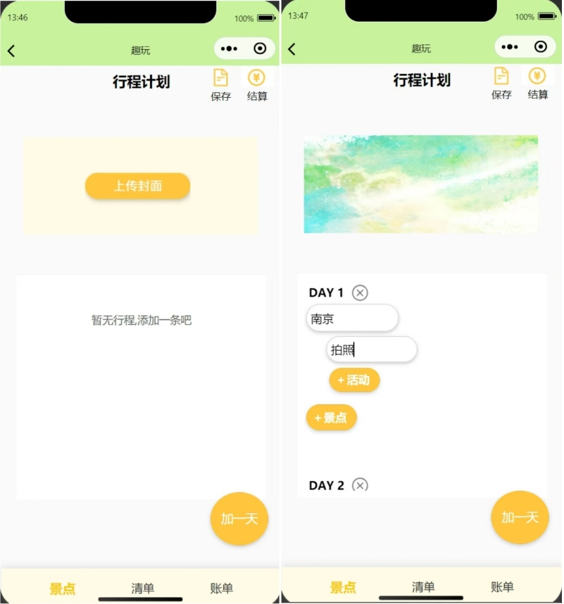 点击添加封面按钮,可以添加旅行封面,点击【加一天】按钮,以当前天数为基础增加一天,点击【+景点】按钮,可以写入要去的景点,点击【+活动】可以写入在此景点要做的活动,天数,活动,景点均可以添加多个。