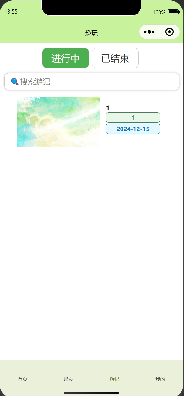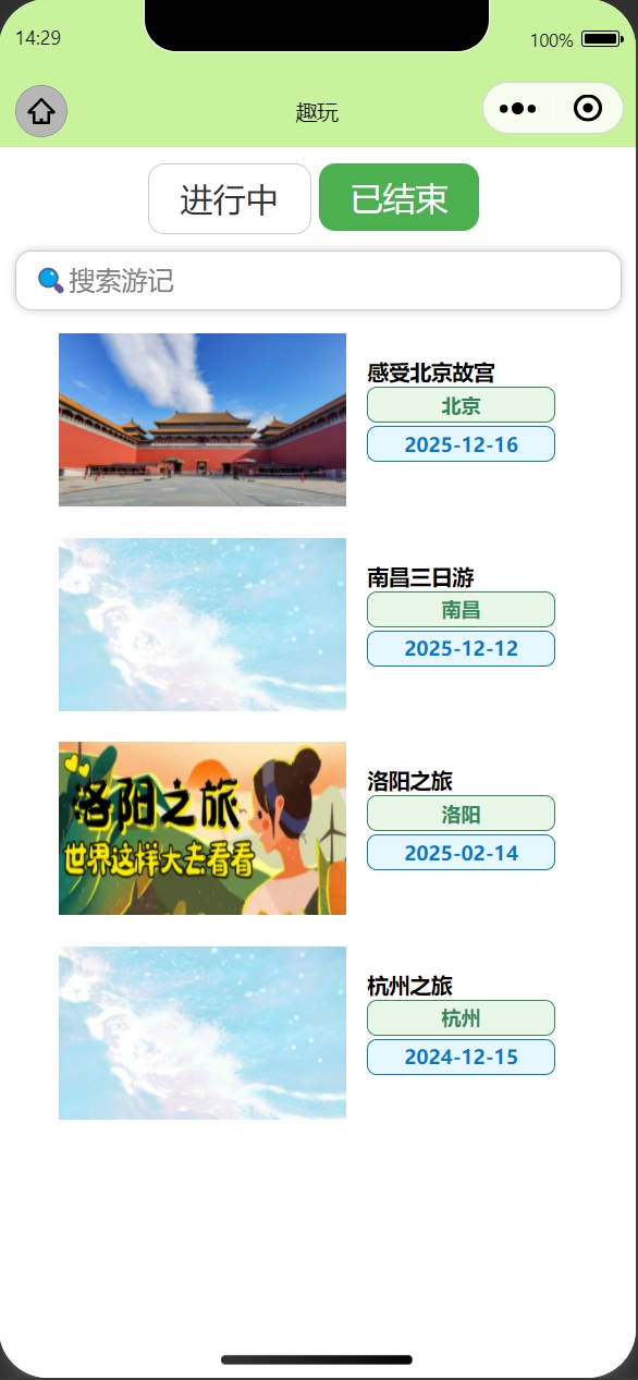 此界面显示所有用户已结束的旅行游记,可以搜索标题关键字筛选游记,点击其中一个旅行即可跳转到对应的游记界面