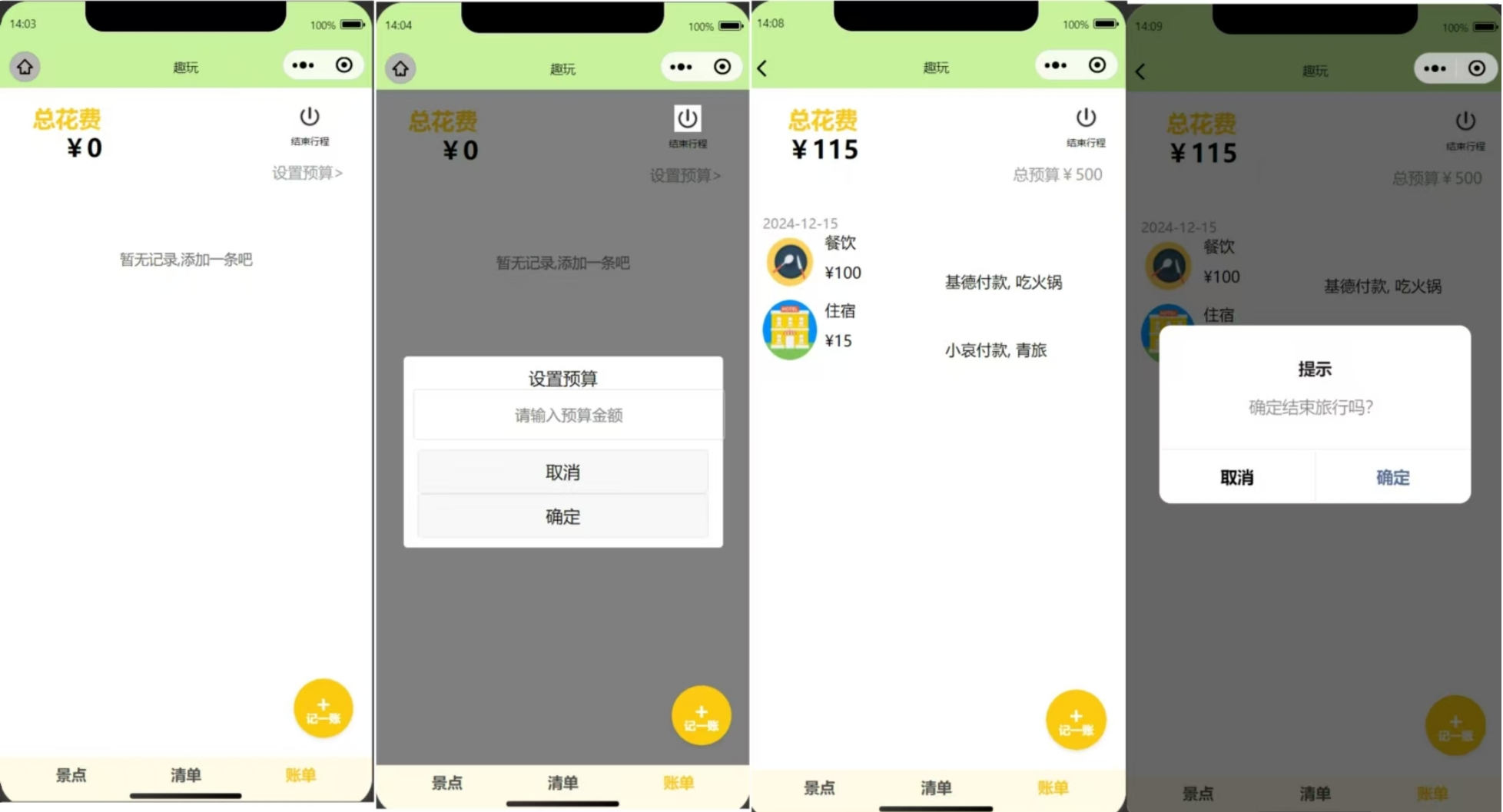 初始界面(左1),添加预算弹窗(左2),添加完效果(左3),结束行程弹窗(左4)