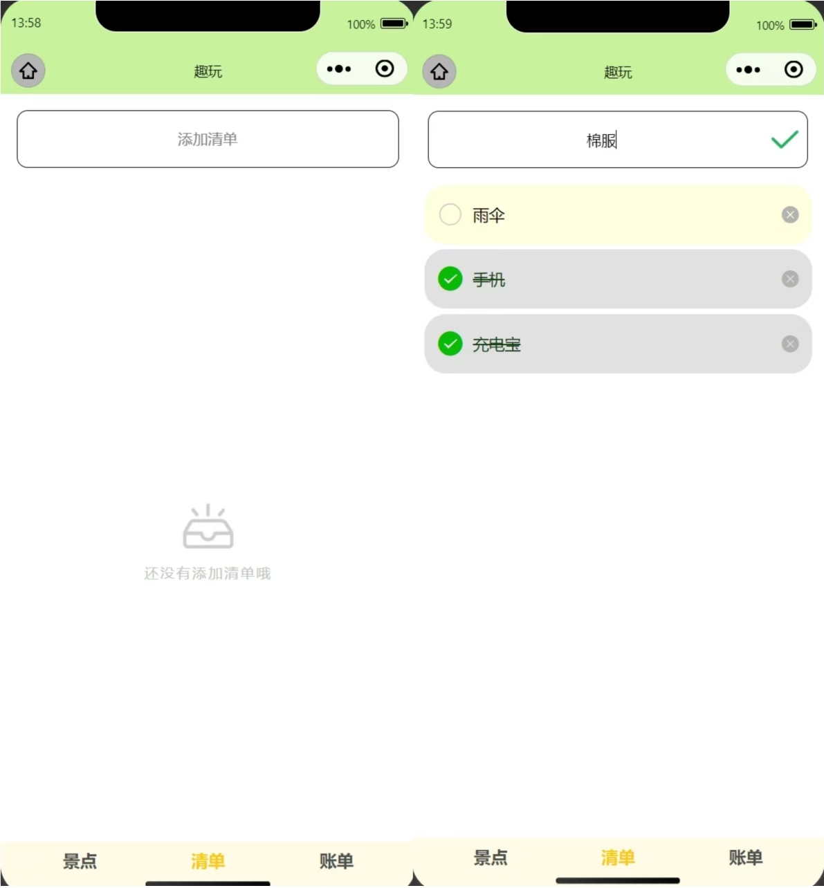 填写时会出现右边的钩,点击钩则确认添加,显示在下方,点击对应物品改变状态,点击叉号可以删除此物品