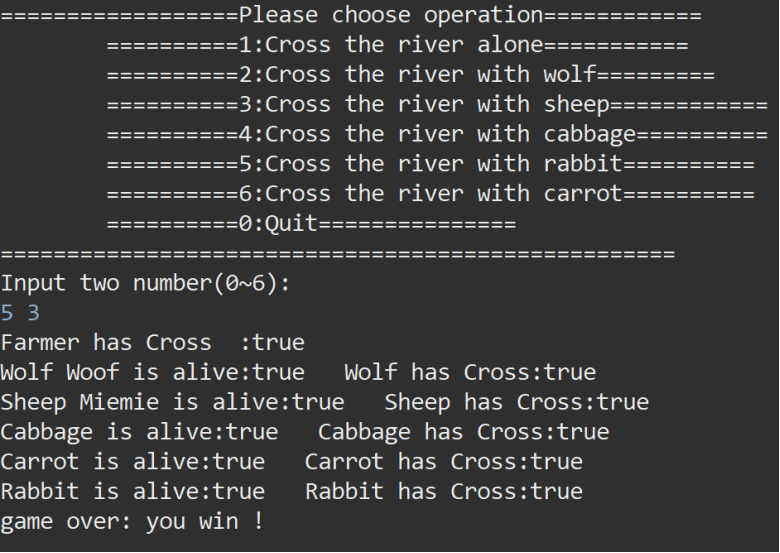 (5) 修改系统功能,运行程序后,用户可以选择玩新规则(五个角色、一次两样东西带过河)或者老规则(三个角色、一次一样东西带过河)的游戏。