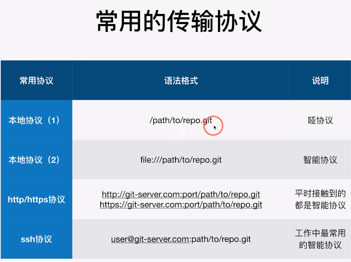 哑协议与智能协议: 直观区别:哑协议传输进度不可见;智能协议传输可见。 传输速度:智能协议比哑协议传输速度快。 # 创建一个裸仓库 k@k-PC MINGW64 /user/dy201/666-backup $ git clone --bare /user/dy201/ 101-GitRunner/ 666-backup/ #使用哑协议 k@k-PC MINGW64 /user/dy201/666-backup $ git clone --bare /user/dy201/101-GitRunner/git_learning/.git ya.git Cloning into bare repository 'ya.git'... done. #使用智能协议 k@k-PC MINGW64 /user/dy201/666-backup $ git clone --bare file:///user/dy201/101-GitRunner/git_learning/.git zhineng.git Cloning into bare repository 'zhineng.git'... remote: Enumerating objects: 30, done. remote: Counting objects: 100% (30/30), done. remote: Compressing objects: 100% (17/17), done. remote: Total 30 (delta 6), reused 0 (delta 0) Receiving objects: 100% (30/30), done. Resolving deltas: 100% (6/6), done. # 和远端仓库建立联系 平时做的变更同步到远端 k@k-PC MINGW64 /user/dy201/101-GitRunner/git_learning (temp) $ git remote add zhineng file:///user/dy201/666-backup/zhineng.git # push操作(本地信息及时更新到远端) $ git push --set-upstream zhineng temp Everything up-to-date Branch 'temp' set up to track remote branch 'temp' from 'zhineng'.