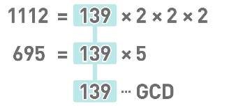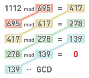 通常的做法是先对两个数字因式分解,找出共同的素数,然后求出最大公约数(GCD)。这样就能求出1112和695的最大公约数为139。然而两个数字越大,因式分解就越难。此时,使用欧几里得算法就能更高效地求解最大公约数。