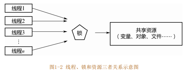 如图1-2所示,多个线程要访问同一个资源。线程就是一段段运行 的代码;资源就是一个变量、一个对象或一个文件等;而锁就是要实 现线程对资源的访问控制,保证同一时间只能有一个线程去访问某一 个资源。打个比方,线程就是一个个游客,资源就是一个待参观的房 子。这个房子同一时间只允许一个游客进去参观,当一个人出来后下 一个人才能进去。而锁,就是这个房子门口的守卫。