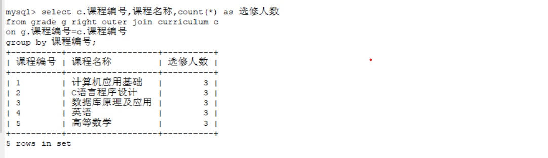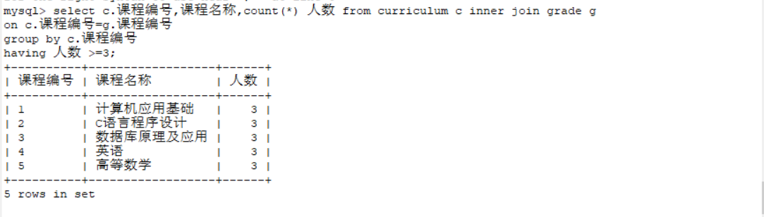 select c.课程编号,课程名称,count(*) 人数 from curriculum c inner join grade g