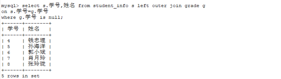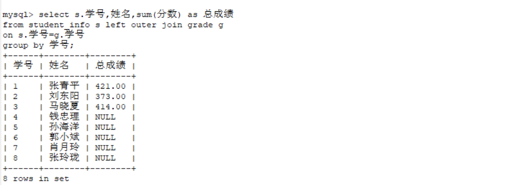 6.使用左外连接查询每个学生的总成绩,要求列出学号、姓名、总成绩,没有选修课程的学生的总成绩为空。