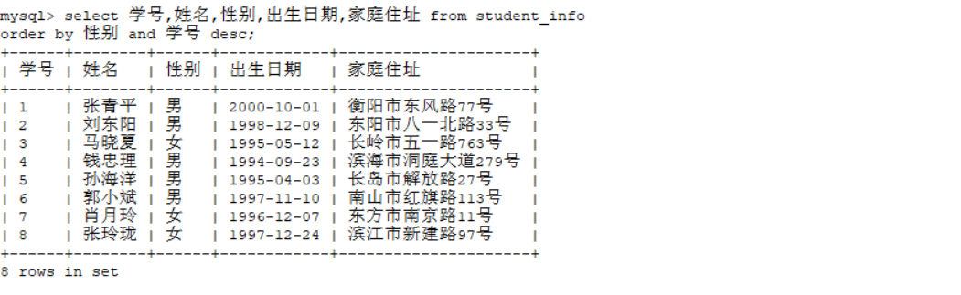 1.对student_info表,查询学生的学号、姓名、性别、出生日期及家庭住址,查询结果先按照性别的由小到大排序,性别相同的再按学号由大到小排序。