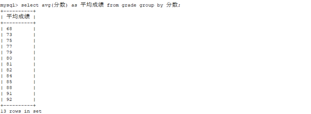 select avg(分数) as 平均成绩 from grade group by 分数;