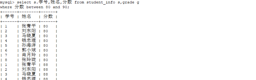 3.查询分数在80-90范围内的学生的学号、姓名、分数