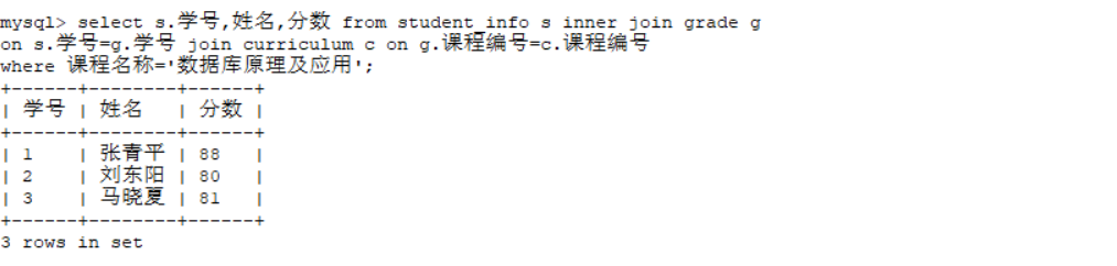 4.使用INNER JOIN连接方式查询学习“数据库原理及应用”课程的学生学号、姓名、分数。