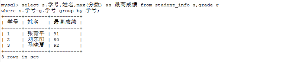 select s.学号,姓名,max(分数) as 最高成绩 from student_info s,grade g