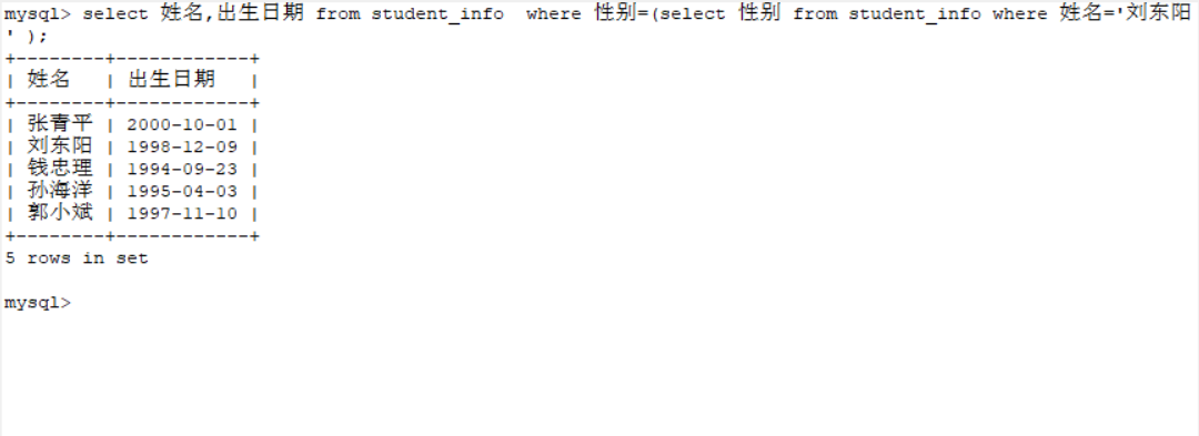 1.在student_info表中查找与“刘东阳”性别相同的所有学生的姓名、出生日期。