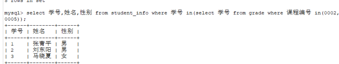 2.使用IN子查询查找所修课程编号为0002、0005的学生学号、姓名、性别。