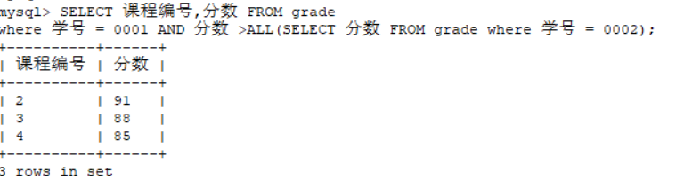 select 课程编号,分数 from grade where 分数>any(select 分数 from grade where 学号='0002') and 学号='0001';