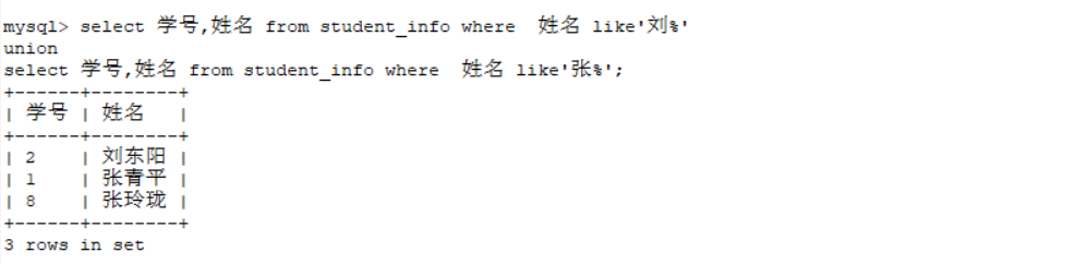 5.使用UNION运算符针student_info表中姓“刘”的学生的学号、姓名与姓“张”的学生的学号、姓名返回在一个表中。