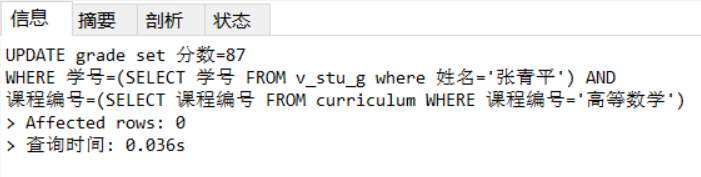 12.利用视图v_stu_g修改姓名为张青平的学生的高等数学的分数为87。