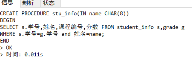 CREATE PROCEDURE stu_info(IN name CHAR(8))