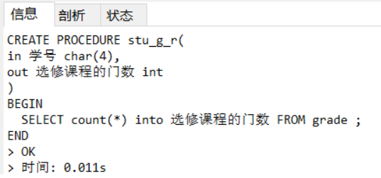 (1)创建一个存储过程stu_g_r,当输入一个学生的学号时,通过返回输出参数获取该学生选修课程的门数。