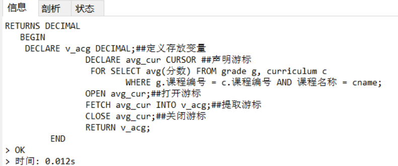 (1)创建一个存储函数avg_func,通过游标统计指定课程的平均分。
