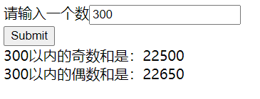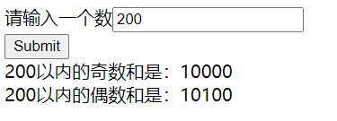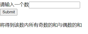 <!DOCTYPE html> <html lang="en"> <head> <meta charset="UTF-8"> <meta http-equiv="X-UA-Compatible" content="IE=edge"> <meta name="viewport" content="width=device-width, initial-scale=1.0"> <title>Document</title> </head> <body> <script type="text/javascript"> window.onload = function(){ var subBtn=document.getElementById("addEmpButton"); subBtn.onclick=function(){ var number=document.getElementById("number").value; var a=0; var b=0; for(var i=1;i<=number;i++){ if(i%2==0){ a+=i; } document.getElementById("oushu").innerHTML=a } for(var i=1;i<=number;i++){ if(i%2==1){ b+=i; } document.getElementById("jishu").innerHTML=b } document.getElementById("jishuz").innerHTML=number+"以内的奇数和是:" document.getElementById("oushuz").innerHTML=number+"以内的偶数和是:" } } </script> 请输入一个数<input type="text" name="number" id="number" /><br> <button id="addEmpButton" value="abc"> Submit </button><br> <span id="jishuz"></span><span id="jishu"></span><br> <span id="oushuz"></span><span id="oushu">将得到该数内所有奇数的和与偶数的和</span> </body> </html>
