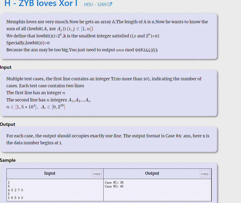 #include <bits/stdc++.h> #include <iostream> #include <cstdio> #include <cstring> #include <algorithm> #include <string> #include <vector> #include <stack> #include <bitset> #include <cstdlib> #include <cmath> #include <set> #define ms(a, b) memset(a,b,sizeof(a)) #define fast ios::sync_with_stdio(false); cin.tie(0); cout.tie(0) #define ll long long #define ull unsigned long long #define rep(i, a, b) for(ll i=a;i<=b;i++) #define lep(i, a, b) for(ll i=a;i>=b;i--) #define endl '\n' #define pii pair<int, int> #define pll pair<ll, ll> #define vi vector<ll> #define vpi vector<pii> #define vpl vector<pll> #define mi map<ll,ll> #define all(a) (a).begin(),(a).end() #define gcd __gcd #define pb push_back #define mp make_pair #define lb lower_bound #define ub upper_bound #define ff first #define ss second #define test4(x, y, z, a) cout<<"x is "<<x<<" y is "<<y<<" z is "<<z<<" a is "<<a<<endl; #define test3(x, y, z) cout<<"x is "<<x<<" y is "<<y<<" z is "<<z<<endl; #define test2(x, y) cout<<"x is "<<x<<" y is "<<y<<endl; #define test1(x) cout<<"x is "<<x<<endl; using namespace std; const int N = 1e5 + 10 ; const int maxx = 0x3f3f3f ; const int mod = 998244353 ; const int minn = -0x3f3f3f ; const int M = 2 * N ; ll T, n, m ; ll a[N] , Case ; ll ba[32] ; ll ans ; ll son[ N*35 ][ 2 ],idx,cnt[ N*35 ] ; void insert(ll n) { int p = 0 ; for ( int i =0 ;i<=30 ; i++ ){ int u = (n>>i) & 1 ; if ( !son[p][u] ){ son[p][u] = ++ idx ; son[idx][0] = son[idx][1] = 0 ; // 将字典树清空的办法 。 将新建的点的子节点全部变为0 cnt[idx] = 0 ; } p = son[p][u] ; cnt[ p ] ++ ; } } void dfs(int g,int deep ){ int l = son[g][0],r = son[g][1] ; if ( cnt[l]==0 && cnt[r]==0 ) return ; if ( r && l ){ ans = ( ( cnt[l]*cnt[r]*ba[deep]%mod ) + ans )%mod; dfs( l , deep+1 ); dfs( r , deep+1 ); }else if ( l ){ dfs( l ,deep+1 ); }else { dfs( r ,deep + 1 ); } } void solve() { cin>>n; ans = 0; idx = 0 ; son[0][0] = son[0][1] = 0 ; rep(i,1,n){ cin>>a[i]; insert(a[i]); } dfs(0,0); ans = ans*2 % mod; // printf("Case #%d: %d\n",Case,ans); cout<<"Case #"<<Case<<": "<<ans<<endl; } int main() { fast; ba[0] = 1; rep(i,1,30) ba[i] = ba[i-1] * 2 ; cin >> T ; Case = 1 ; while ( T-- ) { solve(); Case ++; } return 0; }