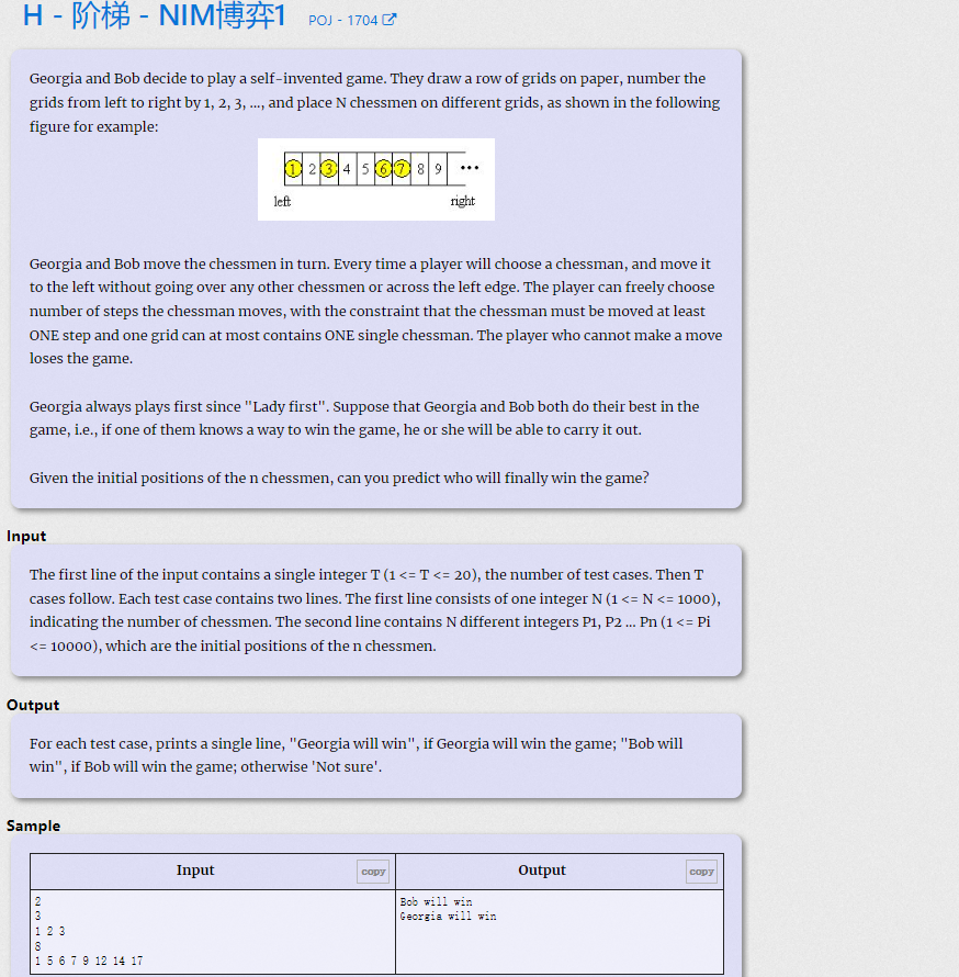 在棋盘上有n个棋子,Bob 与 Georgia 轮流下棋 。Georgia先手(因为她是女生)。