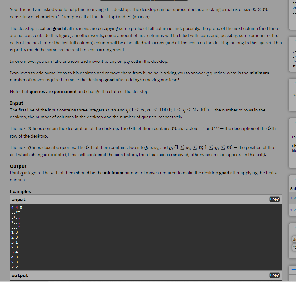 k次询问,每次询问将(x,y)点翻转(*变成 ’ . ‘ , ‘ . ’变成 * )。每次询问中你可以进行若干次操作,每次操作将任意两个位置互换。问每次询问的时,将其变成好的桌面的时候要多少次操作。