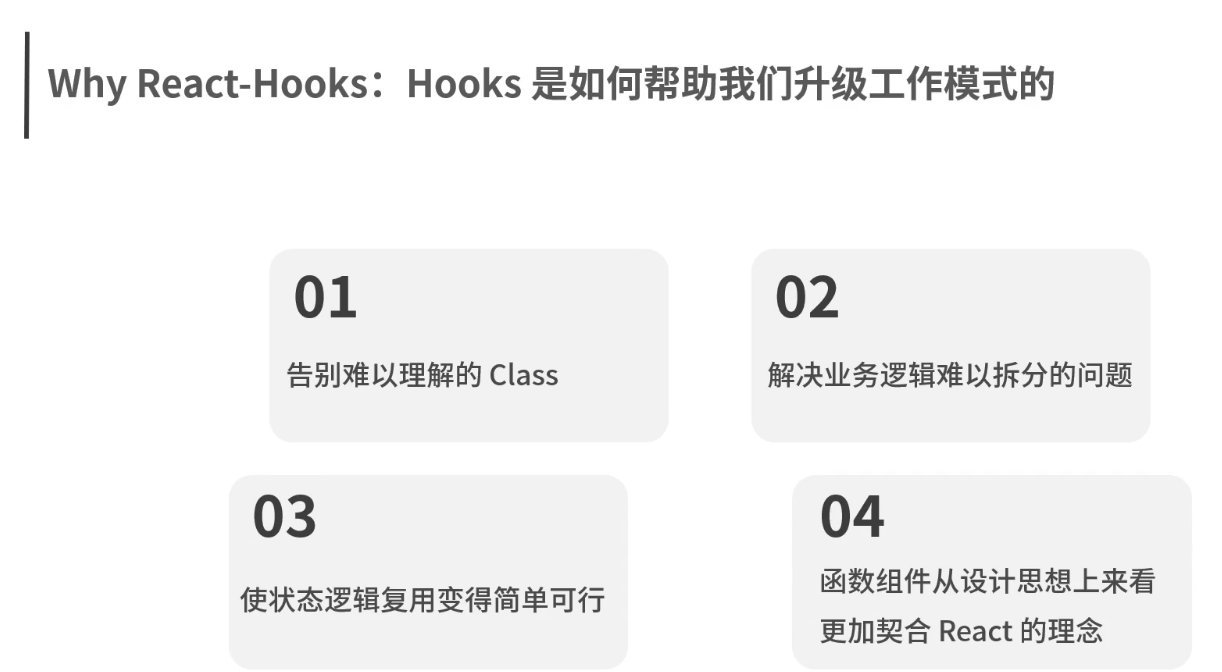 React-Hooks:是React团队在React组件开发时间中逐渐认知到的一个改进点,背后设计对类组件和函数组件两种组件形式的思考和 侧重