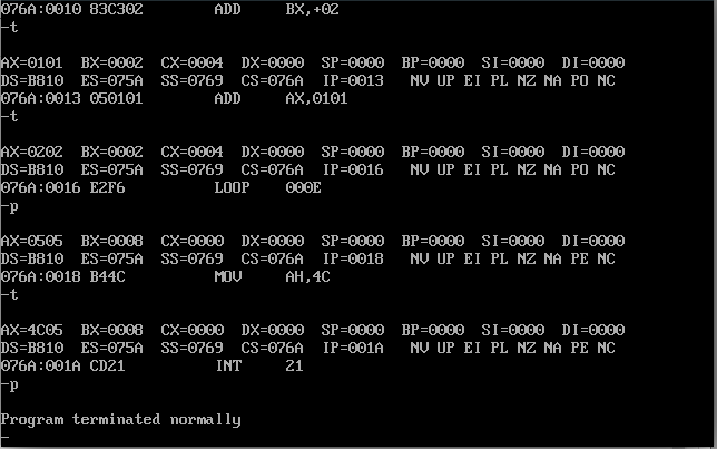 灵活使用t命令、p命令、g命令,对ex2.exe进行调试