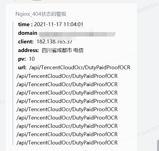 "content": " <font color=\"comment\"> Nginx_404状态码警报 </font> \n > ** time :** {} \n > ** domain :** {} \n > ** client: ** {} \n > ** address: ** {} \n > ** pv: ** {} \n > ** url: ** {} ".format(now_time,daemin,client,QueryElastsearch().getip_isp(client),len(url),'\n'.join(url[0:10]))