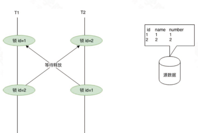 2、事务中死锁:两个事务都持有对方需要的锁,并且在