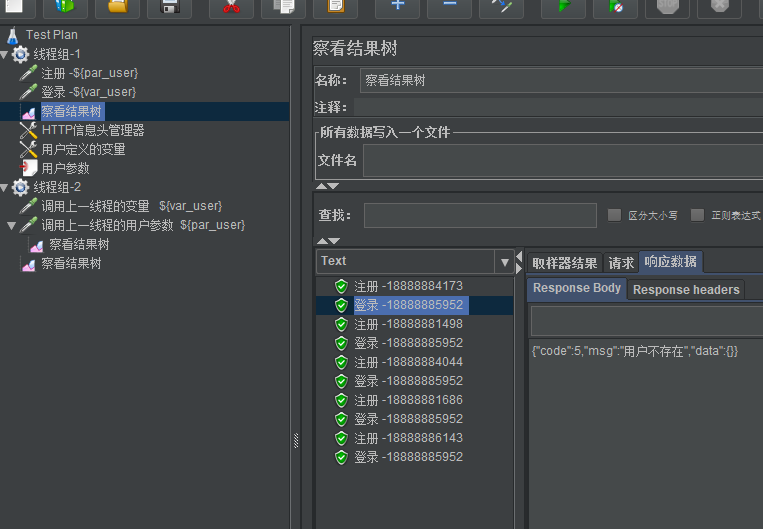 答案是: 1次register-success 5次login-success (因为用户定义变量 ,获取一次值,在运行过程中,不会动态获取值,在运行过程中,值一直都不变)