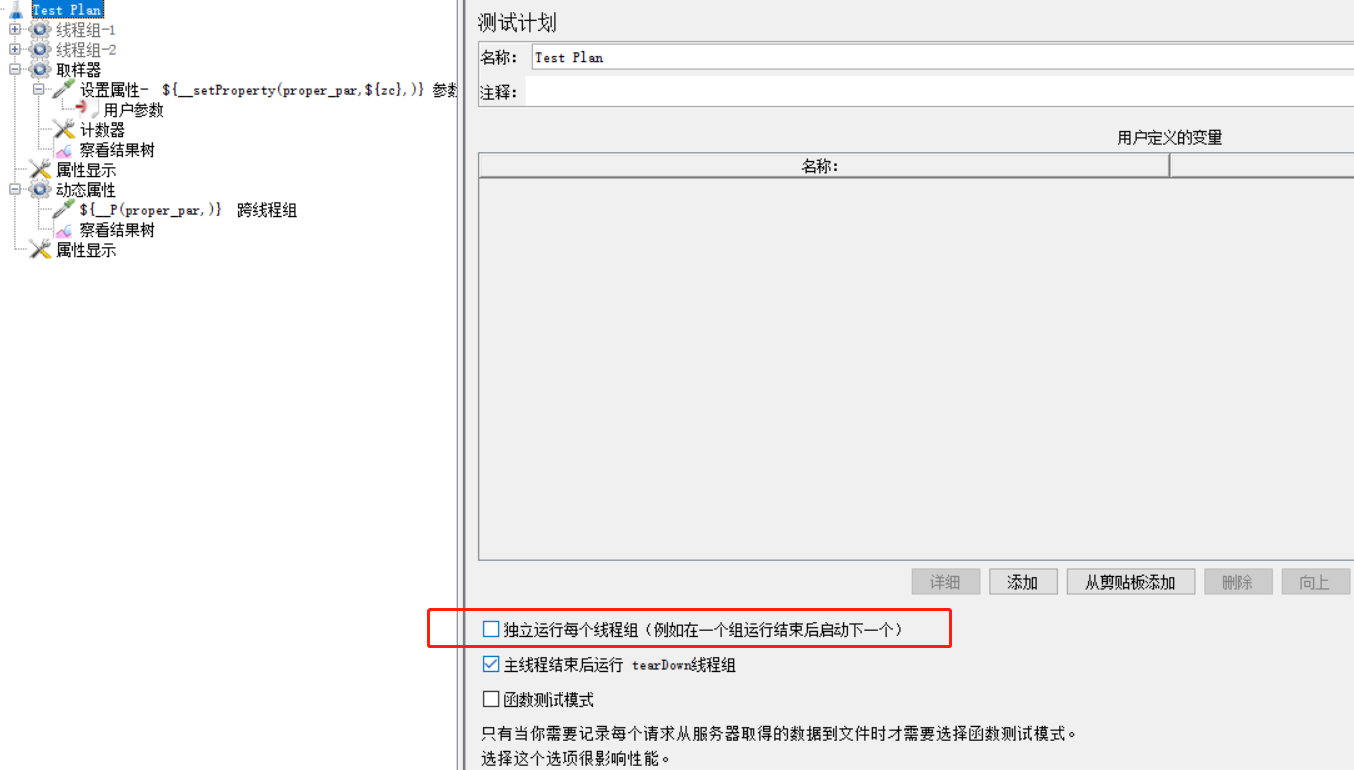 A:在性能测试中,我们不会勾选测试计划中 独立运行每个线程组