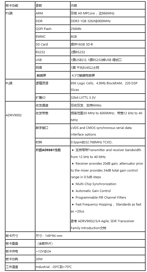 板卡由ADI ADRV9002+Xilinx XC7Z020-CLG484芯片设计的整板,包含双路射频输入输出通道,支持千兆网络,RS232,触摸屏等接口,双核ARM支持Linux操作系统。板卡功耗很低,适合自定义的无线协议开发,如Loar、Wifi、4G平台等,也适合无线手持机、图传模块的产品开发。