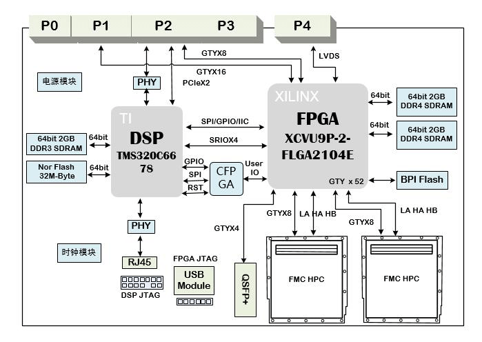 板卡基于6U VPX标准结构,包含一个C6678 DSP芯片,一个XCVU9P 高性能FPGA,双路HPC FMC。