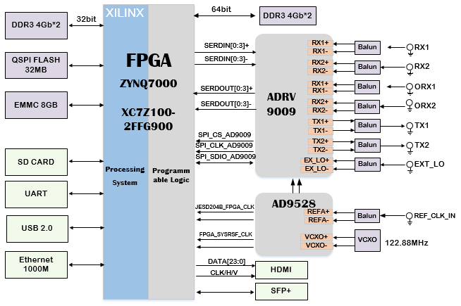 PL端外扩ADRV9009芯片,ADRV9009是一款高集成度射频(RF)、捷变收发器,提供双通道发射器和接收器、集成式频率合成器以及数字信号处理功能。这款IC具备多样化的高性能和低功耗组合,具有2路输入,2路输出,两路观测输入配合FPGA工作满足3G、4G和5G宏蜂窝时分双工(TDD)基站应用要求。