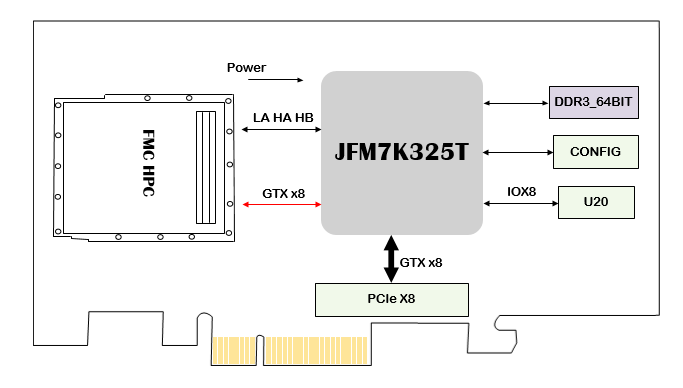 本板卡基于 FPGA JFM7K325T 芯片,pin_to_pin兼容FPGAXC7K410T-2FFG900 ,支持PCIeX8、64bit DDR3容量2GByte,HPC的FMC连接器,板卡支持各种接口输入,软件支持windows,Linux驱动。