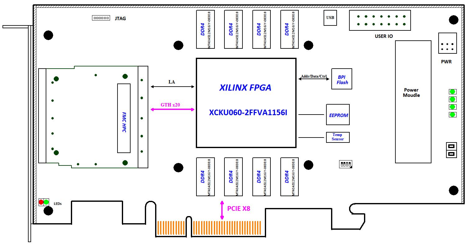 板卡主控芯片采用Xilinx 公司的 Kintex UltraScale系列FPGA XCKU060-2FFVA1156。板载 2 组 64bit 的DDR4 SDRAM,每组容量2GB,可稳定运行在2400MT/s。支持PCIE Gen3 x8模式及一路FMC HPC接口。同时可提供 Windows,Linux 上位机驱动。