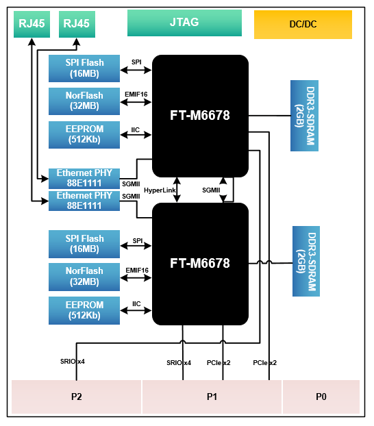 ● DSP 之间 通过Hyperlink x4 互联。 ● DSP之间 通过SGMII 互联。 ● DSP1 连接PCIe x2 ,SRIO x4至VPX-P1。